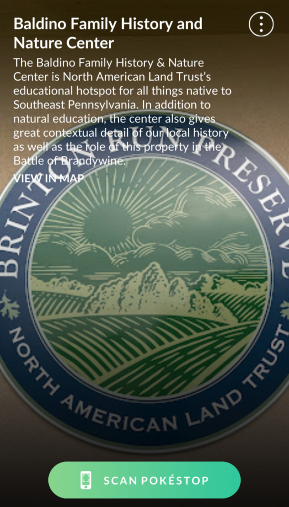 PokeStop at the Brinton Run Preserve Baldino Family History and Nature Center.