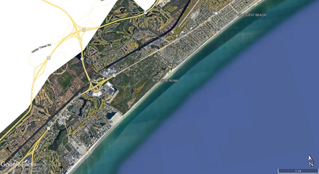 Myrtle Beach is a beloved coastal destination, drawing families from across the country for its high energy beach offerings. The “Grand Strand” is defined by high-rise hotels, condominiums, beachfront estates, putt-putt courses, souvenir shops, and the full spectrum of vacation tourism infrastructure. From an aerial perspective, the coastline reflects decades of steady development, with little remaining evidence of its original natural landscape.